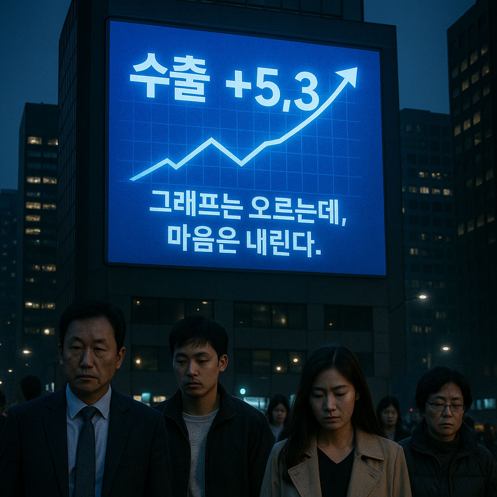 숫자는 웃는데, 얼굴은 웃지 않는다 — 수출 둔화와 ‘감정경제’의 경고 수출은 늘었지만 삶은 여전히 불황선 아래. GDP 착시이론으로 본 ‘성장의 함정’과 ‘신뢰의 붕괴’.