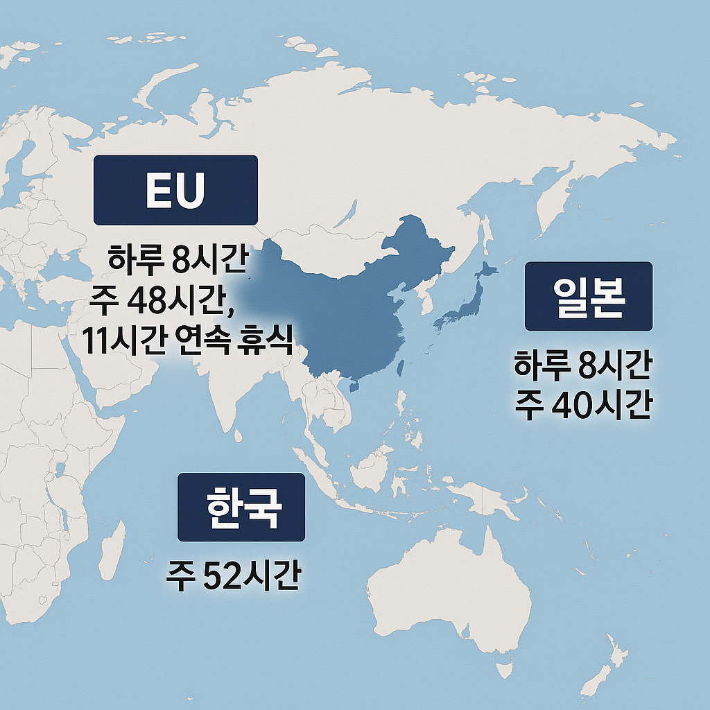 주 52시간제와 하루 단위 규제는 무엇이 다르나요? → 주 단위는 주간 총량 관리, 하루 단위는 매일 상한을 두는 방식입니다. 노동자에게 유리한 방식은 무엇인가요? → 하루 단위 규제가 건강권 보호에는 유리하지만, 주 단위 규제는 임금 유연성을 제공합니다. 기업은 왜 하루 단위 규제를 반대하나요? → 프로젝트형 산업에서 단기 집중근무가 어렵고, 국제 경쟁력이 약화될 수 있기 때문입니다. 국제 기준은 어떤가요? → EU는 하루 8시간, 주 48시간, 연속 11시간 휴식을 규정합니다. 일본은 하루 8시간, 주 40시간을 기본으로 합니다.