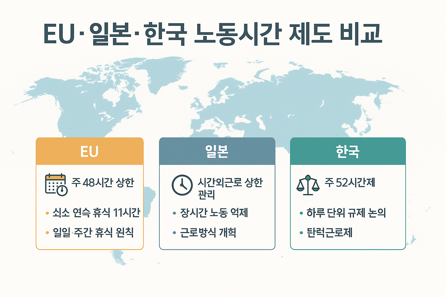 ㅇ “노동계, 하루 단위 규제가 없으면 과로 사회는 계속된다” 앞선 이론적 분석이 보여주듯 하루 단위 규제는 건강권과 직결된다. 그렇다면 실제 현장에서 노동계는 어떤 목소리를 내고 있을까? 민주노총과 한국노총은 최근 성명을 통해 “주 단위 총량 규제로는 하루 16시간 노동이 합법이 된다”며 이를 합법적 과로사 제도라고 규정했다. 특히 IT·건설업 현장은 프로젝트 마감이나 납기일 직전, 노동자가 하루 14~16시간 근무를 강요받는 사례가 많다. 주 단위로만 계산하면 법 위반은 아니지만, 노동자는 건강을 잃는다. 이 때문에 노동계는 하루 단위 상한을 명문화해야 한다고 주장한다. ➡ 핵심 요약: 노동계는 주 단위 계산이 과로를 합법화한다며 하루 단위 규제를 강력히 요구한다. ㅇ “하지만 경영계는 유연성이 사라진다고 우려한다” 노동계의 주장은 타당하지만, 경영계의 우려 역시 무시하기 어렵다. 한국경영자총협회(경총)는 하루 단위 상한이 도입되면 기업 유연성이 크게 훼손된다고 경고했다. 글로벌 공급망 경쟁에서 특정 시기에는 노동 집중이 불가피한데, 하루 단위 규제가 이를 막으면 납기 지연, 생산 차질이 불가피하다는 것이다. 특히 인력 풀이 작은 중소기업은 인건비 부담과 운영 곤란으로 이어질 수 있다고 주장한다. 대신 경영계는 월 단위 탄력근로제 확대를 대안으로 제시하고 있다. “노동시간 계산을 하루에만 묶어 두면 한국 기업은 경쟁에서 밀린다”는 것이 경영계의 일관된 논리다. ➡ 핵심 요약: 경영계는 하루 단위 규제가 국제 경쟁력을 해친다며 월 단위 탄력근로 확대를 요구한다. ㅇ 그렇다면 “정부는 어떤 선택을 준비하고 있을까?” 노동계와 경영계가 첨예하게 맞서는 상황에서 정부는 균형점 찾기에 나섰다. 고용노동부는 “주 단위 총량만으로는 장시간 노동 집중을 막기 어렵다”는 점을 인정하면서도, 모든 업종에 하루 단위 상한을 일괄 적용하는 것은 현실적이지 않다고 본다. 따라서 하루 단위 규제를 원칙으로 하되, 특정 업종에는 월 단위 탄력근로를 제한적으로 허용하는 다층적 제도 설계가 논의되고 있다. 예컨대 IT 개발 프로젝트, 계절성이 강한 제조업, 단기 집중이 필요한 건설업은 일정 조건 하에 예외를 둘 수 있다는 구상이다. ➡ 핵심 요약: 정부는 하루 단위 규제를 기본으로 하되, 업종별 예외를 설계하는 절충안을 검토하고 있다. ㅇ “결국 여론은 하루 단위 규제를 지지하는 쪽으로 기울고 있다” 현장의 목소리와는 달리 일반 국민의 여론은 하루 단위 규제에 더 무게를 두고 있다. 조선일보(2025.10.05) 조사에 따르면 국민 61%가 하루 단위 제한 도입에 찬성했고, 특히 MZ세대의 지지율은 7를 넘어섰다. 이는 노동시간 계산 방식을 둘러싼 사회적 가치관이 변화하고 있음을 보여준다. 과거 세대가 “더 많이 일해 더 많이 번다”를 중시했다면, 새로운 세대는 “워라밸과 삶의 질”을 더 우선시한다. 하루 단위 규제 논의는 세대별 가치관 충돌이자 사회 전환의 징후다. ➡ 핵심 요약: 여론은 특히 MZ세대를 중심으로 하루 단위 규제를 지지하며 삶의 질을 강조한다. ㅇ “해외 사례는 어떤 교훈을 주는가?” 마지막으로 해외는 어떻게 노동시간을 계산할까? 일본은 하루 최대 근로시간을 13시간으로 제한했고, EU는 하루 연속 11시간 휴식 보장을 의무화했다. 이는 하루 단위 상한이 국제적으로 이미 보편적 기준임을 보여준다. 반면 미국은 주 단위 규제 중심인데, 장시간 노동과 과로사 문제가 여전히 사회 갈등의 원인으로 남아 있다. 한국이 하루 단위 규제를 도입한다면, 국제 기준에 부합하면서 과로 사회를 줄일 수 있는 길로 나아갈 수 있다. ➡ 핵심 요약: 해외 선진국은 하루 단위 규제를 기본으로 두고 있으며, 한국도 국제 기준에 맞추어야 한다.