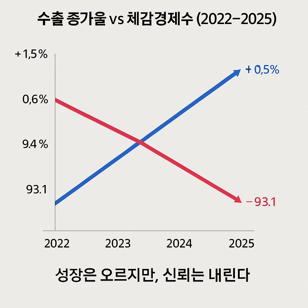 Q1. 최근 한국 수출이 둔화된 이유는 무엇인가요? A. 반도체를 중심으로 한 산업 편중, 글로벌 교역 둔화, 교역국 경기 악화 등이 복합적으로 작용하고 있습니다. 특히 제조업 중 다수가 회복세를 보이지 못해 총수출의 균형이 깨진 상태입니다. Q2. 수출은 늘었는데 왜 국민은 불황을 느끼나요? A. GDP는 생산 중심 지표이지만, 국민은 소비와 소득 중심으로 경제를 체감합니다. 즉, ‘성장은 국가의 것’이고, ‘체감은 개인의 것’이라서 괴리가 발생합니다. Q3. GDP 착시이론이란 무엇인가요? A. 경제성장률이 생활 수준의 개선으로 이어지지 않는 현상을 설명하는 이론입니다. 국가 총생산이 늘어도 분배나 체감소득이 나아지지 않으면 ‘성장의 착시’가 생깁니다. Q4. 감정경제란 어떤 개념인가요? A. 경제가 감정과 신뢰의 흐름에 따라 작동한다는 이론입니다. 물가, 일자리, 소득 같은 지표보다 사람들의 ‘감정적 신뢰’가 경기 회복의 핵심 변수로 작용합니다. Q5. 정부는 왜 “경제가 좋아졌다”고 강조하나요? A. 정책 성과는 지표로 측정되기 때문입니다. 하지만 감정경제 관점에서는 국민이 체감하지 못한 ‘성장 홍보’는 오히려 정책 불신을 키울 수 있습니다. Q6. 반도체 편중이 왜 위험한가요? A. 특정 산업에 의존할수록 경기 변동성이 커지고, 고용 창출 효과가 낮아집니다. 수출이 늘어도 일자리와 소득이 따라가지 못하면 국민 체감경기는 악화됩니다. Q7. 앞으로 필요한 변화는 무엇인가요? A. 성장 중심 정책에서 신뢰 중심 정책으로의 전환입니다. 정부는 ‘숫자경제’보다 ‘감정경제’의 체계를 구축해야 하며, 국민이 경제의 주체로서 회복감을 느끼게 해야 합니다.전히 불황선 아래에 머물러 있다. ■ GDP 착시이론은 “성장은 늘었지만 삶은 멈춘” 현상을 설명한다. ■ 반도체 편중 성장과 내수 둔화는 구조적 불균형의 신호다. ■ 경제는 숫자가 아니라 신뢰로 움직이며, 신뢰가 감정경제의 핵심이다. ■ 정책은 ‘성장률 홍보’보다 ‘체감률 회복’에 초점을 맞춰야 한다. ■ 결국 경제의 회복은 수출이 아니라 ‘신뢰의 회복’에서 시작된다.