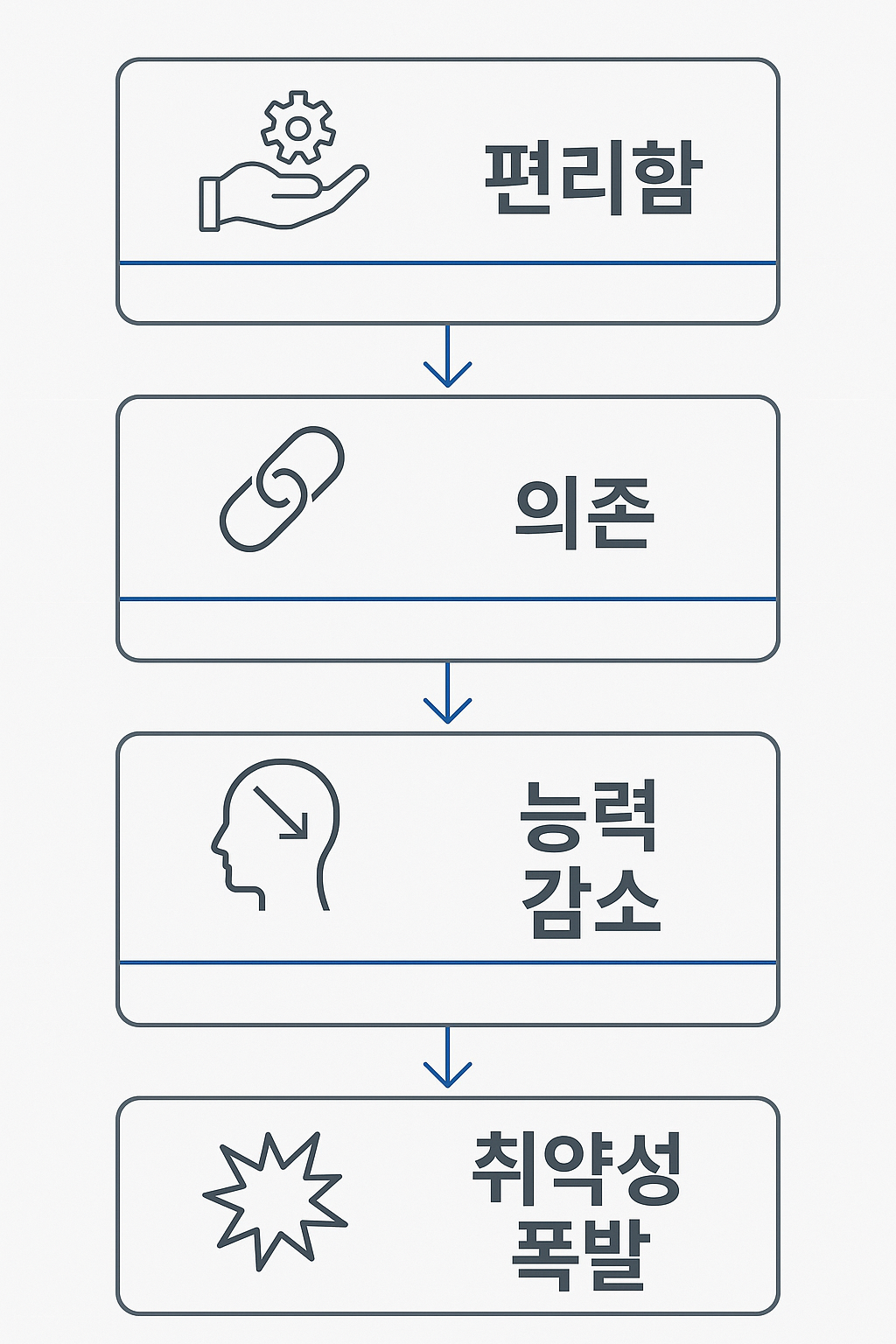 AI 장애는 기술적 사건이 아니라 인간 능력의 거울이다. 이 혼란을 해석하기 위해서는 단순한 기술 문제가 아니라, 인간의 선택·습관·사고체계를 설명하는 다양한 이론이 필요하다. 아래의 다섯 가지 이론은 우리가 왜 스스로 ‘고장 나기 쉬운 인간’으로 변했는지를 구조적으로 보여준다. ① 행동경제학 — “우리는 편리함을 거부할 수 없는 존재다” 행동경제학은 인간이 자동화·단순화·외주화를 사랑하는 이유를 설명한다. 핵심은 *인지적 비용 회피(cognitive cost avoidance)*이다. ● 시스템이 해주는 일은, 인간은 더 이상 하지 않게 된다. 계산기가 등장한 후 암산 능력이 급격히 퇴화했고, 자동 번역기를 사용한 뒤 외국어 문해력은 눈에 띄게 줄었다. 그리고 오늘, AI가 업무의 절반을 처리해주자 인간은 더 이상 ‘생각하는 습관’을 유지할 동기가 줄어든다. ● 지속적 편리함 → 습관화된 의존 → 능력 감소 이것이 행동경제학이 말하는 의존성 길들이기다. 그리고 그 결과로 인간은 “차단되었을 때 아무것도 할 수 없는 존재”로 변화한다. ② 인지이론 — “자동화는 인간의 뇌를 얕게 만든다” 인지과학에서는 반복적 자동화가 인간의 문제 해결 능력을 ‘얕은 층(shallow cognition)’으로 고정하는 효과가 있다고 설명한다. ㅇ 알고리즘이 대신 선택해주는 사회 ㅇ 추천이 대신 판단해주는 사회 ㅇ 알림이 대신 기억해주는 사회 이런 환경에서 인간의 뇌는 점점 깊은 사고(deep thinking)를 하지 않게 된다. ● “고장이 나면 무엇을 해야 하지?” 이 질문에 답하지 못하는 이유는 AI 장애가 아니라 우리 인지 체계가 이미 자동화에 적응해 버렸기 때문이다. ③ 네트워크 이론 — “초연결은 강점이자 치명적 약점이다” 네트워크 이론의 핵심은 연결이 깊을수록 취약성도 커진다는 역설이다. 하나의 장애가 결제 → 유통 → 의료 → 교통으로 전이된 이유는 우리의 사회 인프라가 “거대한 하나(One Big System)”로 작동하고 있기 때문이다. ● 단일 실패점(SPoF, Single Point of Failure) 오늘날의 디지털 인프라는 마치 신경망처럼 촘촘하게 연결되어 있다. 덕분에 효율은 극대화되지만, 단 하나의 노드(node)가 고장 나면 전체가 동시정지(co-stop) 된다. 이것은 기술이 아니라 사회 구조의 문제다. ④ 시스템 리스크 이론 — “효율성은 취약성을 만든다” 오늘의 사회는 ‘효율’을 위해 모든 중복을 제거했다. 이중화, 수동 매뉴얼, 종이 문서, 오프라인 경로… 모두가 “비효율”이라는 이유로 퇴출됐다. 하지만 시스템 리스크 이론은 말한다. “효율을 극대화하면, 복원력은 최소화된다.” 이번 장애는 기술의 실패가 아니라 효율 중심 구조가 만든 복원력 부재의 결과였다. ⑤ 기술사회학 — “우리는 기술을 선택한 것이 아니라, 기술에 우리를 맡겼다” 기술사회학은 인간-기계 관계를 설명한다. 과거에는 기술이 인간을 보조했다. 지금은 기술이 인간의 결정·기억·판단·업무를 대신한다. 즉, 기술은 ‘도구’가 아니라 인간 활동의 전제조건이 되었다. 그래서 기술이 멈추면 인간도 멈춘다. 이번 사태는 기술 고장이 아니라 인간 주권의 축소를 드러낸 사건이었다. 💡 [요약] AI 장애는 인간 능력 감소의 결과 행동경제학: 편리함 → 의존 → 능력 약화 인지이론: 자동화 → 깊은 사고 붕괴 네트워크 이론: 초연결 → 전이 위험 확대 시스템 리스크: 효율성 → 복원력 상실 기술사회학: 기술 의존 → 인간 기능의 외주화