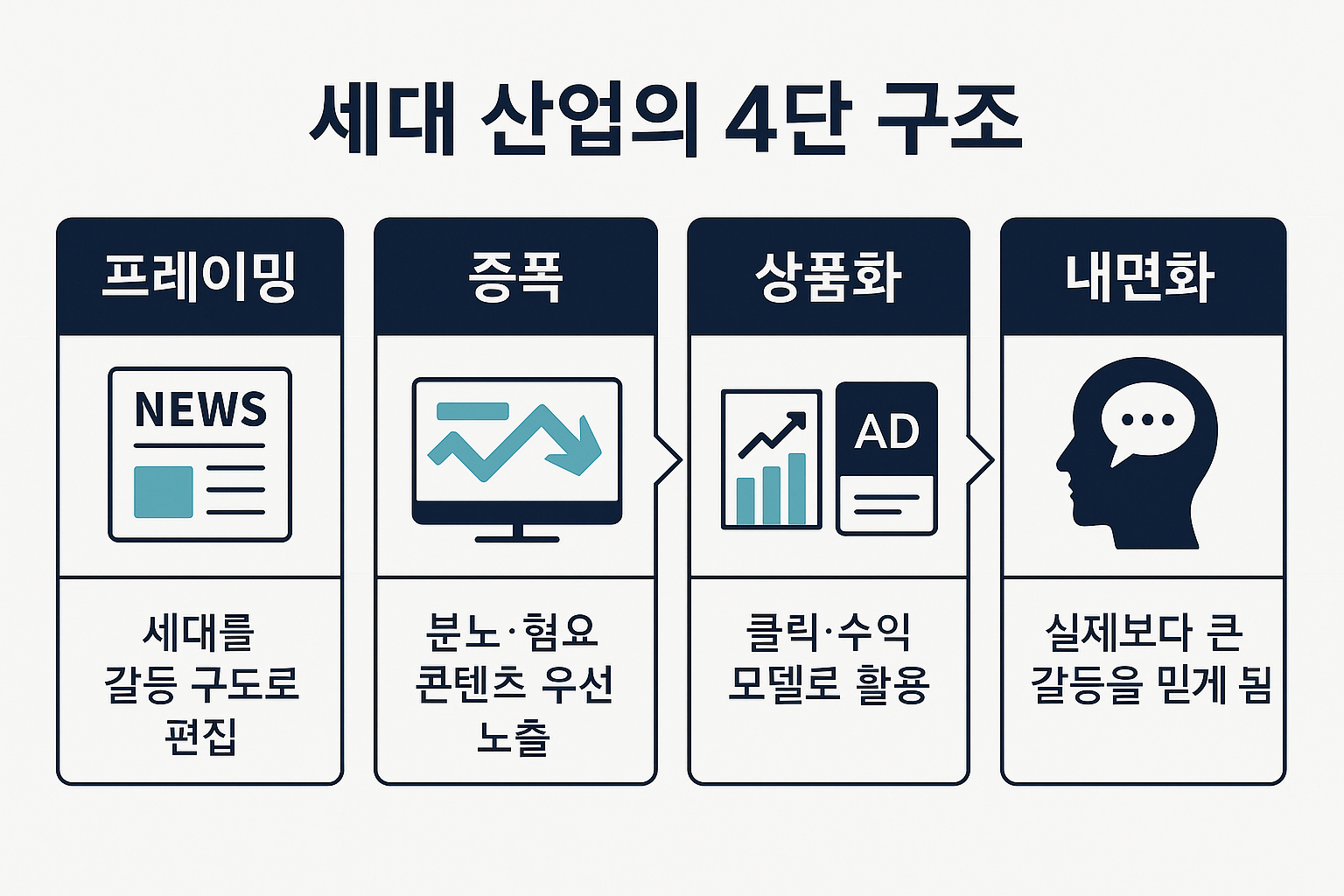 “MZ와 영포티, 직장서 생활방식·가치관 충돌” (매일경제, 2025.11.21) “세대별 소비 패턴 차이 커져… MZ ‘가치소비’ vs 40대 ‘실용소비’” (조선비즈, 2025.11.18) “직장 내 세대 갈등 심화… 커뮤니케이션 교육 확산” (한국경제, 2025.11.14) “정치권, 선거 앞두고 세대별 공약 차별화 전략 강화” (세계일보, 2025.11.11) “플랫폼 알고리즘, ‘세대 갈등 콘텐츠’ 노출 늘려” (한겨레, 2025.11.07) ----------------------------------- 아침 지하철에서 흔히 볼 수 있는 장면이다. 어느 40대 직장인은 “MZ는 최소한의 예의도 없다”고 말하듯 신문 기사에 달린 댓글을 훑는다. 이어 뒤편에서는 한 20대가 “40대는 꼰대라서 문제”라며 친구에게 요즘 직장 이야기를 툭 던진다. 두 사람은 서로를 모른다. 말 한마디 나눈 적도 없다. 하지만 둘 다 ‘상대 세대’에 대해 누군가가 정해놓은 이미지처럼 말하고 있는 자신을 발견한다. 놀라운 것은, 이 두 사람 사이에서 실제로 벌어진 갈등 사건은 단 하나도 없다는 점이다. 그런데도 이들은 이미 서로를 향해 ‘전쟁 중’인 것처럼 말하고 있다. 왜일까? 그 해답은 ‘세대 갈등’이 이미 우리 사회의 주요 서사(main narrative)가 되었기 때문이다. 뉴스는 세대 간 차이를 외치고, 플랫폼은 ‘세대 논란’ 영상에 알고리즘 우선순위를 주며, 정치는 세대를 표적 집단으로 분리해 전략적 메시지를 던진다. 그 과정에서 실제보다 과장되고 단순화된 이미지들이 매일 우리 앞에 재생산된다. ㅇ MZ는 예민하다 ㅇ 영포티는 꼰대다 ㅇ MZ는 소비지향이다 ㅇ 영포티는 안정지향이다 이 문장들은 설명이라기보다 라벨(Label)에 가깝다. 실제 데이터를 보면 세대 간 가치 차이는 생각보다 크지 않다. 직장 태도·소비 기준·정치 성향도 충돌이라기보다 생애주기의 차이에서 나타난다. 즉, 각 세대가 부딪히는 경제·주거·노동 환경이 다른 시기에 다르게 주어졌기 때문이다. 하지만 언론과 알고리즘은 이 복잡한 구조를 ‘간단한 갈등’으로 재포장한다. 갈등은 클릭을 만든다. 논쟁은 체류시간을 늘린다. 세대는 플랫폼에서 가장 쉬운 수익모델이다. 이처럼 ‘세대 갈등’은 현실에서 발생한 감정보다 산업 구조가 주입한 감정에 가깝다. 우리는 실제 세대와 부딪히기보다 언론과 알고리즘이 만들어낸 ‘상대 세대의 이미지’와 부딪히고 있는 것이다. 그래서 이 글은 이렇게 묻고자 한다. “세대가 서로를 미워한 것이 아니라, 미워하게 만드는 구조 속에서 살아온 것은 아닐까?” 이 질문을 따라가면, 세대 갈등이라는 오래된 상처가 어쩌면 ‘상처’가 아니라 ‘설계된 구조’였음을 이해할 수 있게 된다.