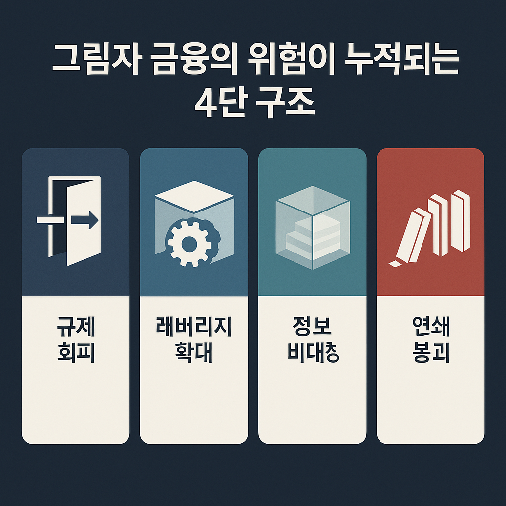 Q1. 그림자 금융(Shadow Banking)은 정확히 무엇인가? A. 은행 밖에서 운영되는 대출·투자·유동화·파생상품 시장 전체를 의미한다. 규제를 피해 성장하기 때문에 위험이 감춰진 채 확대되는 것이 특징이다. Q2. 시장은 왜 연준(Fed)의 경고에도 불구하고 조용한가? A. 유동성 착시 때문이다. 돈이 아직 완전히 빠져나가지 않아 자산 가격이 위험을 반영하지 않는 상태이기 때문이다. 겉은 안정, 속은 취약이라는 전형적 패턴이다. Q3. 그림자 금융이 금융위기를 더 크게 만드는 이유는? A. 규제가 약한 영역에서 레버리지·부채·위험이 빠르게 누적되기 때문이다. 붕괴가 시작되면 은행보다 훨씬 급격하게 연쇄적으로 무너진다. Q4. 왜 우리는 금융위기 직전의 착각을 반복하는가? A. “지금까지 괜찮았으니 앞으로도 괜찮다”는 정상성 편향(Normalcy Bias) 때문이다. 사람들은 조용한 시장을 ‘안정’으로 오해한다. Q5. 개인 투자자가 가장 조심해야 할 금융상품은 무엇인가? A. 구조가 복잡하거나 레버리지가 숨어 있는 상품이다. 특히 사모펀드·대체대출·레버리지 ETF처럼 위험 정보가 불투명한 상품은 주의가 필요하다. Q6. 그림자 금융은 규제가 강해지면 왜 더 커지는가? A. 금융은 규제가 강해질수록 규제 밖으로 이동한다. 은행 규제가 강화되면 위험이 비은행권·사모펀드·대체대출로 옮겨가기 때문이다. 이것이 금융의 경로의존적 진화 패턴이다. Q7. 지금 투자자가 가져야 할 가장 중요한 태도는 무엇인가? A. 공포가 아니라 경계심이다. 가격이 안정적이라고 해서 위험이 적은 것이 아니며, 연준이 경고할 때는 이미 시스템 내부에 보이지 않는 균열이 생긴 상태다. “보이지 않는 위험을 없는 위험으로 착각하지 않는 것”이 가장 중요하다.